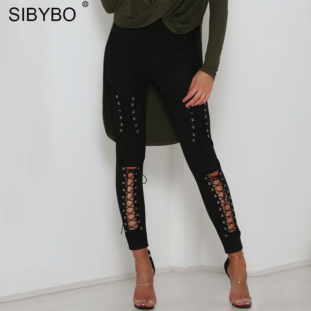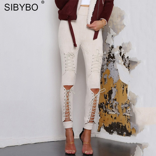 Sibybo Suede Bodycon Bandage Pants Women 2018 Autumn Winter Legging Sexy Slim Club Party Trousers Women Ladies Pencil Pants
